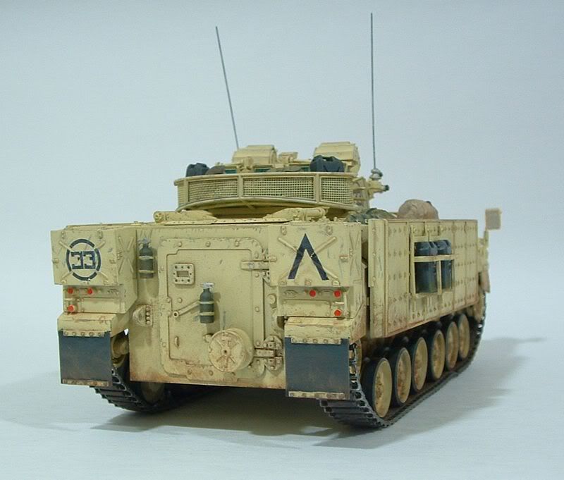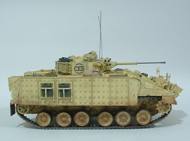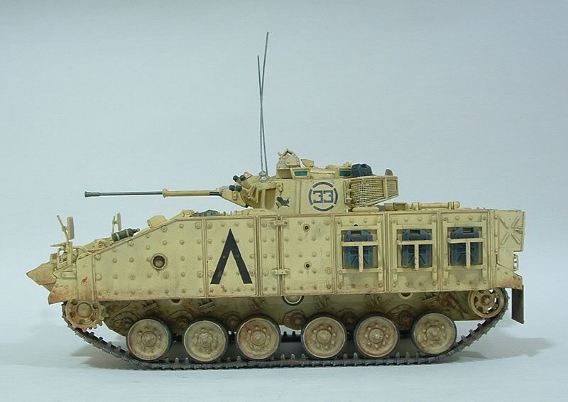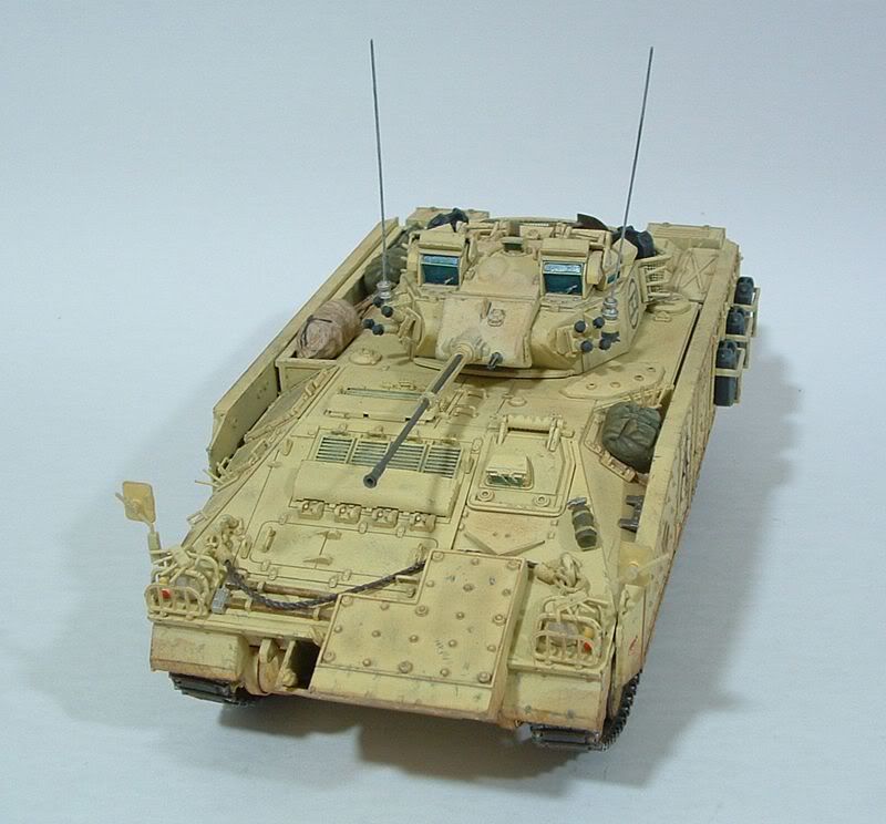 O modelo foi todo pintado com Acrilex (mistura de areia, amarelo e branco), e o wheathering dos rebites e recessos está sendo inicialmente com betume bem diluído. Ainda vai ter mais coisa - chipping, manchas, highlights nas arestas, etc... A torre tá quase pronta, o trabalho maior é no chassi mesmo.